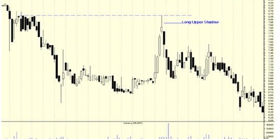 Después de una tendencia alcista parece continuar con ventas importantes con subidas relevantes con grandes ganancias que suele llevar a tocar zonas de resistencia, gran sobrecompra o control importante. En un momento determinado el mercado parece darse cuenta que se ha pasado con las subidas y los bajistas empiezan a tomar el control del valor poniendo los precios a niveles similares a los de apertura o inferiores. Las sombras dejadas durante la sesión terminan siendo resistencias relevantes.