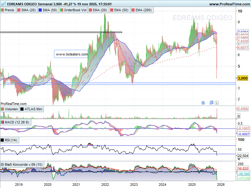 Las principales cifras que pueden justificar los descensos es la reducción del Ebitda, tanto actual como el de los próximos años, como el descenso de sus ingresos «prime» que tan buenos resultados le han dado anteriormente. El descenso de las expectativas es significativo, pero el castigo sigue siendo excesivo. El punto importante es la ausencia de acuerdo con Ryanair para vender sus billetes, lo que se refleja en un importante descenso en sus ventas. Resulta llamativo que la compañía indique que está trabajando en IA para un crecimiento acelerado e indique de la misma manera un descenso en las expectativas.