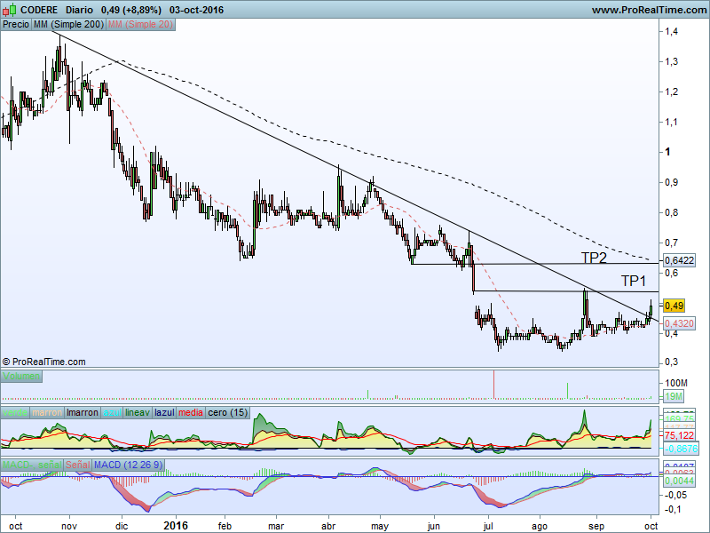 Codere lleva un año en caida con una bajista que la ha estado frenando cada vez que ha intentado rebotar y de nuevo ha ido a por ella aunque y parece haberla superado de manera clara y con volumen. Esto ha abierto una oportunidad para ir a buscar 0,54 como primera parada y un objetivo más ambicioso se encuentra en 0,62 coincidente en este momento con la mm200 que sería lógico que hiciera de freno. Esta subida seguramente sea rápida, al menos hasta el primer objetivo, sin dar opciones a entrar a quien no esté posicionado como acostumbra a hacer el valor. El stop está claro, si llega a entrar por debajo de la bajista de nuevo habrá que salirse del valor.