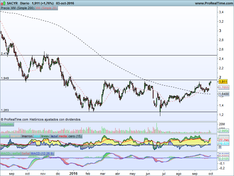 Menuda subida lleva Sacyr desde que a principios de verano volviera a tocar mínimos en el entorno de 1.25. Esa caida coincidente con el brexit sirvió para hacer suelo y salir hacia arriba sin prisa pero sin pausa llegando a la resistencia donde se encuentra actualmente.