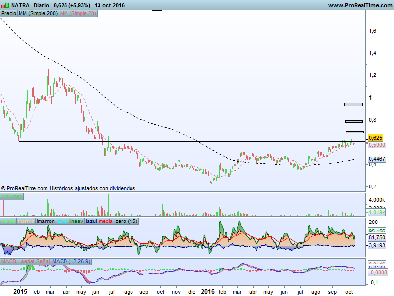 Centrándonos en su cotización a día de hoy podemos ver que lleva una importante recuperación en los últimos tiempos y que ahora mismo se encuentra en su primera resistencia importante en 0.6 que fue donde rebotó a mediados de 2012, finales de 2014… Es decir, un antiguo soporte que se ha tornado en resistencia. Visto lo que ha hecho hoy podríamos decir que lo ha superado con volumen, aunque una resistencia que en principio es tan importante lo mejor siempre es ver su confirmación. Hace unas sesiones también lo superó y volvió a ponerse por debajo en las sesiones siguientes, aunque pienso que fue tan solo un respiro.