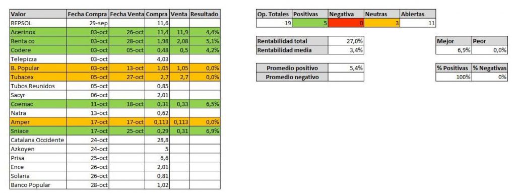 - Sniace. Como ya he ido comentando a lo largo de la semana por otras redes fue perdiendo fuerza a lo largo de la semana y decidí salir. Esperaba que llegara a 0.29 y ahí posiblemente rebotar. El objetivo de 0.29 lo cumplió e incluso ha cerrado la semana por debajo. Mejor la olvido y me conformo con la rentabilidad que me ha dado.