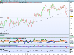 Ebro últimamente es una acción lateral que nos ha servido para aplicar entradas en las dos maneras en las que se puede operar, de extremo a extremo del lateral o al romperlo para buscar un objetivo con la diferencia de ese lateral. Tras haber hecho un primer lateral entre 16.5 y 18.5 realizó otro que llevó a la acción hacia la zona de 21 donde por más que lo ha intentado no ha podido superar. El no poder superar esa resistencia unido a la presentación de unos resultados que el mercado se ha tomado un poco a la tremenda ha llevado al valor al soporte/resistencia de 18.5.