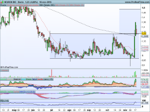 Neuron biofarma es una empresa de baja capitalización que se ha calentado estos últimos días. Llevaba tiempo dentro de un lateral y lo ha roto gracias a noticias con mucho volumen. Para afianzar la opción de rotura ha hecho un pull back a la resistencia perdida convertida ahora en soporte y terminó cerrando la semana cerca de ese soporte.