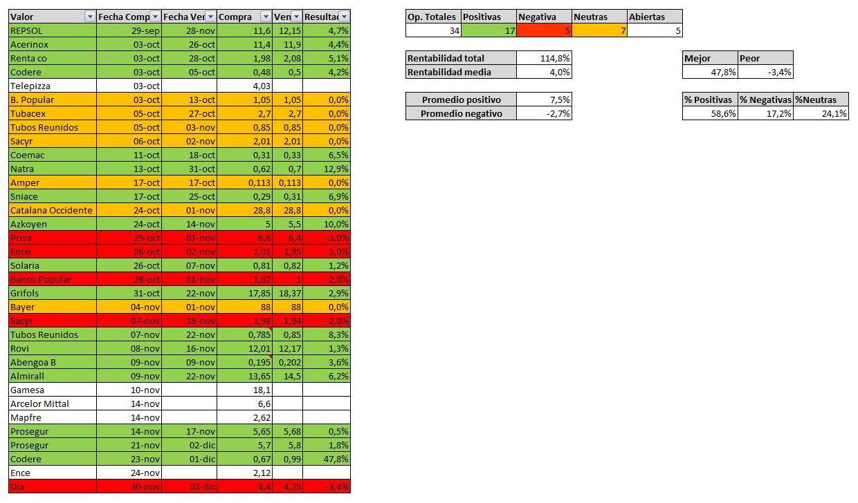 - Repsol. Comenté la semana pasada que era un valor que tenía poco movimiento a corto y a principio de semana salió de la cartera esperando que la OPEP no alcanzara un acuerdo de esa magnitud. La subida posterior la perdí, pero ante la duda lo mejor es estar fuera de cualquier valor y la reunión iba a dar mucha volatilidad sin saber el sentido. Lo importante es que se sacó beneficio aunque bastante menos de lo esperado.