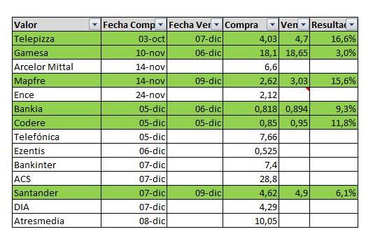 - Codere. Esta entrada fue simple especulación. Un valor que había estado caliente la semana anterior y que abrió con un gap importante a la baja. Comprar y vender en el mismo día que ha dado unas plusvalías muy buenas.