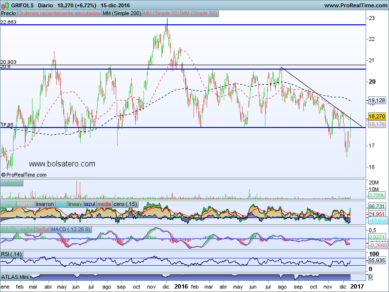 Idéntico movimiento que Rovi. Pérdida de soporte importante (17,85), no llega a cumplir el objetivo bajista y remonta. En este caso hay que decir que el último empujón se ha debido a Hecho Relevante. Subía pero no terminaba de entrar en el lateral y el HR lo ha conseguido. A pesar de ello es el valor más peligroso de los comentados. No solo por tener que necesitar una noticia para superar resistencia sino porque las manos fuertes están huyendo del valor. Se puede entrar en el valor pero eso hay que tenerlo en cuenta. La entrada sería superando la bajista dentro del lateral para buscar la parte alta del mismo (20,6). El stop lógico sería perder el soporte.