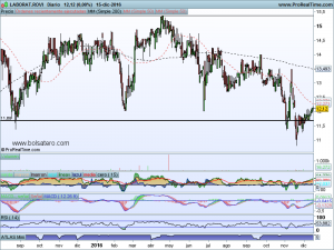 Tras varios intentos de apoyo en la zona de 11,5 acabó cediéndola y la acción encontró apoyo en 11 desde donde ha ido remontando. El antiguo soporte se convirtió en resistencia dura que le supuso varias sesiones en la zona. Parece que eso ya queda atrás y se encamina hacia arriba. Su primer objetivo sería la media de largo plazo (13,4 hoy) y posteriormente el techo del lateral. El stop que se pondría sería la pérdida del soporte, que no está tan lejos.