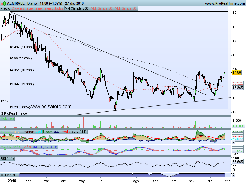 La verdad que Almirall está dibujando bastante bien. Hizo una caída en 5 y ha ido recuperando poco a poco. Primero superó la bajista y llegó hasta el 38.2 fibo pero ahí se estancó y no ha subido más. Al menos hasta ahora porque eso puede cambiar en breve. Puede cambiar porque es un nuevo ataque a ese nivel y esta vez parece que viene con más fuerza. De hecho las manos fuertes están incorporadas al mismo cosa que no ha ocurrido otras veces. Y viene con más fuerza porque todos los indicadores a todos los plazos están marcando compra.