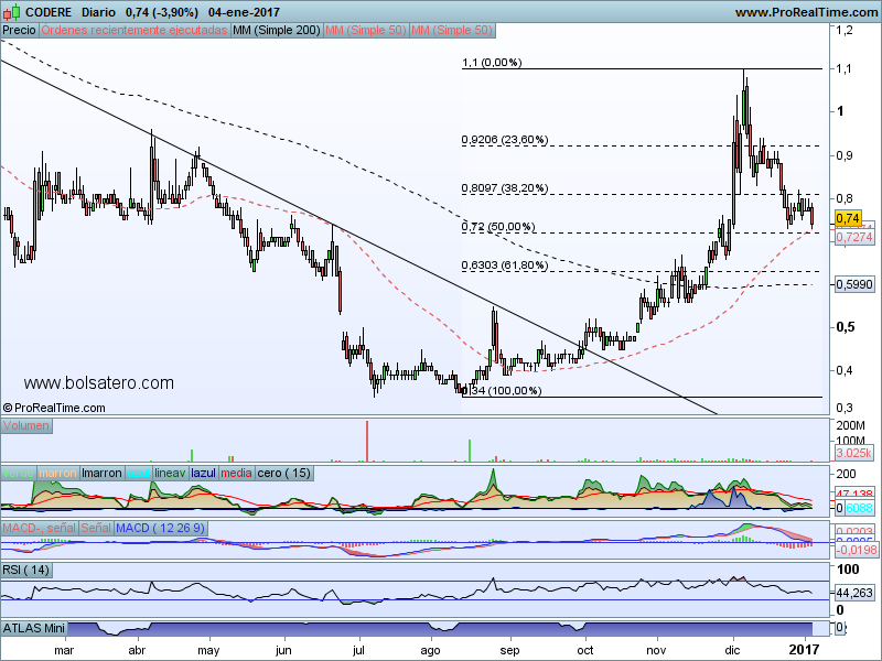 - Codere. No es que quiera creérmelo demasiado pero da que pensar. Con todo el mercado alcista no ha sido capaz de recuperar el 38.2 fibo y su volumen ha descendido de manera importante al intentar la subida. Si pierde 0.72 la visita a 0.63 parece clara. Anularía el escenario bajista superando 0.8.