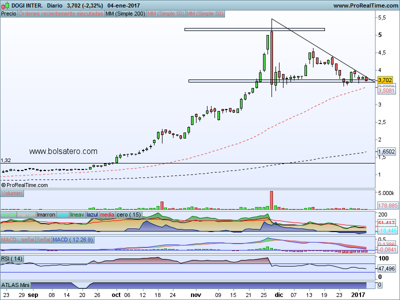 - Dogi. Ha ido haciendo máximos decrecientes apoyándose siempre en la zona de 3.6. Vemos que de perder la zona habría que esperarla en la zona de 3. Las manos fuertes están saliendo desde hace tiempo y el volumen se ha secado. Superar la bajista haría pensar en cambio de escenario que confirmaría la superación de 4.