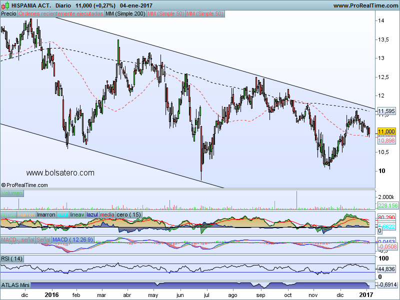 - Hispania. Se encuentra dentro de un canal bajista de largo plazo. Intentó superar la parte superior pero se encontró con la media de largo plazo que la está haciendo retroceder. Es de esperar una visita a 10 y anularía dicho escenario superando 11.6.