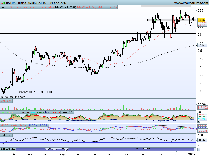 - Natra. Un valor muy volátil que se ha estado moviendo entre 0.6 y 0.75 últimamente. En este caso lo que hace pensar en volver a la parte inferior de esa zona es la divergencia bajista existente. Superando 0.75 anularía ese escenario.