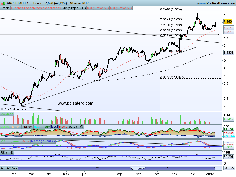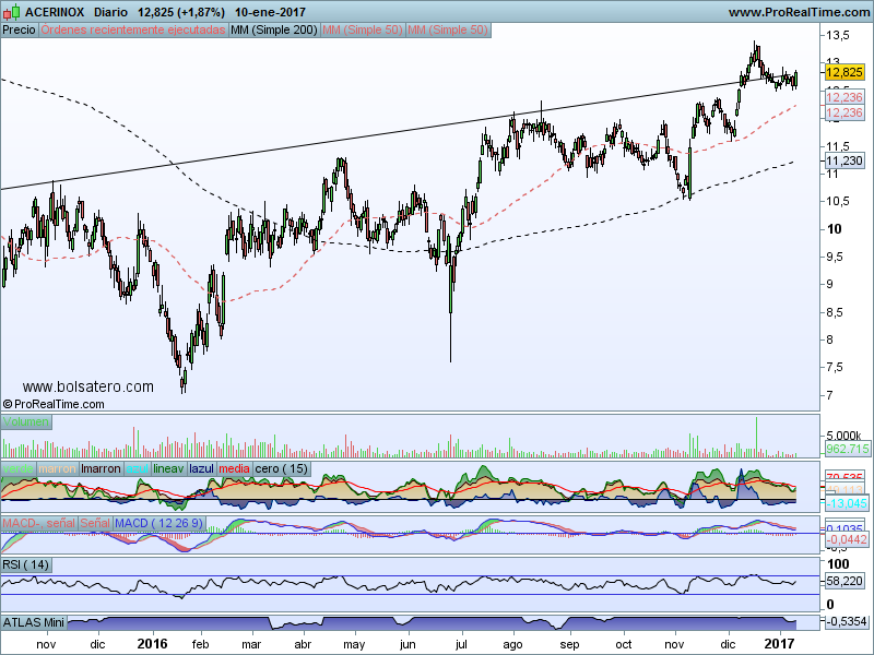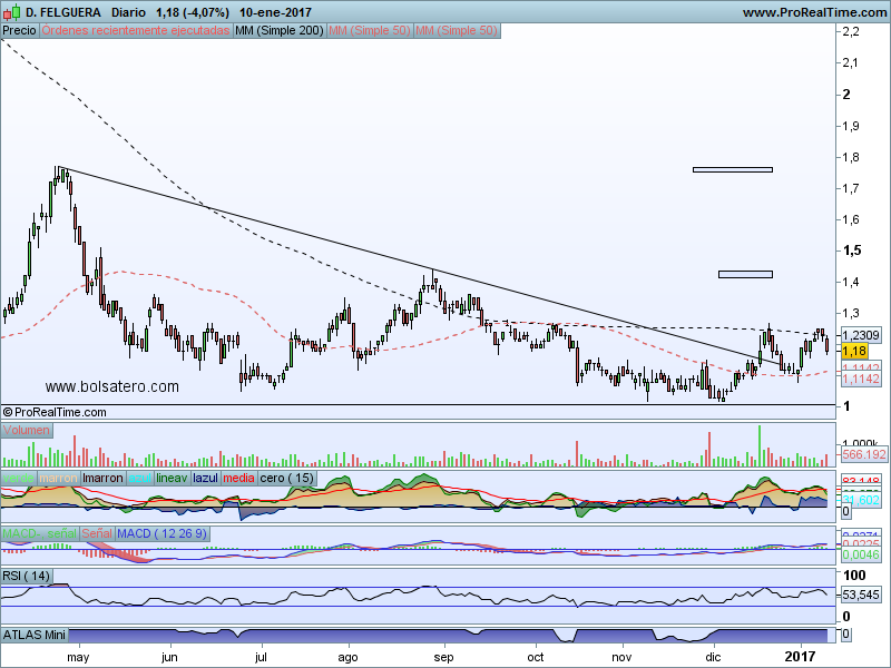 El precio está indicando que no puede con la zona de la mm200. En principio sería un valor para ponerse corto pero puede darnos sorpresas pronto. La razón es que el Macd sigue marcando compra y es más alcista que la vez anterior que lo intentó y también las manos fuertes siguen entrando de manera importante en el valor. ¿Confiamos en el valor? Por si acaso mejor esperar que el precio lo marque…