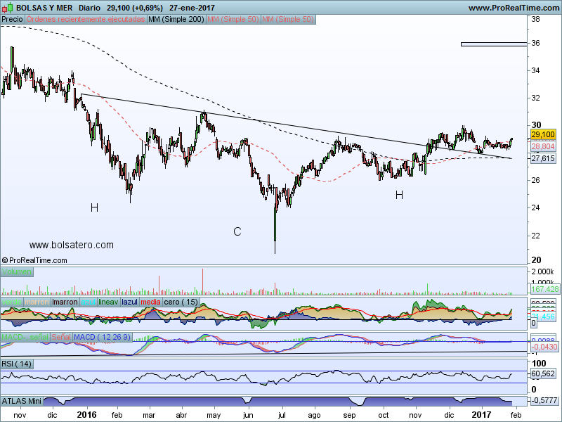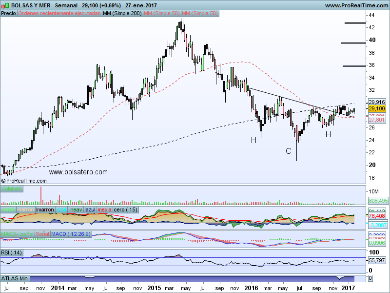 BME es un valor de los considerados refugio. Esto quiere decir que, entre otras cosas, su volatilidad es baja. La acción, por tanto, habría que operarla siempre pensando en el medio plazo. Después de haber cotizado en 2015 en el entorno de 44 se vino abajo la acción hasta perder un 50% de su cotización. Tras ello ha ido desarrollando una posible figura de Hombro-Cabeza-Hombro invertido que podríamos aprovechar. De hecho incluso hizo un pull back a la línea clavicular, lo que afianza ese planteamiento. El escenario viene acompañado de divergencias que afianzan la idea de la figura comentada. El dividendo de la acción también es un punto importante a considerar, ya que eso suele hacer que el mercado siempre la mire con buenos ojos.