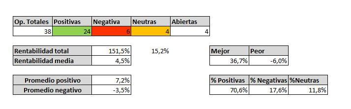 En cuanto a mi cartera no ha sido la mejor semana. Algunos valores no han cumplido sus expectativas y han terminado saliendo y otros simplemente han saltado el stop. Ha habido más sesiones operaciones negativas de lo esperado, sobre todo por entrar en el mundo chicharro. A pesar de ello el resumen de las operaciones no ha sido malo y la semana ha cerrado con ganancias a nivel global. Mejor explicamos las operaciones con detalle.
