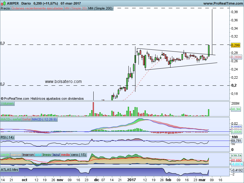 Menudo calentón el de Amper hoy. Ha sido claramente la estrella del mercado. Ha superado los máximos precedentes y ha abierto el camino para buscar cotas importantes. Lejos quedan ya los precios de 0.15 a los que cotizaba hace apenas unos meses. Vista la subida de hoy podemos pensar que se nos ha ido el valor pero nada más lejos de la realidad. El valor va a seguir subiendo otro tramo y solo hemos dejado que confirmase la rotura. El precio estaba dibujando un banderín y había que esperar a su rotura. Seguramente podríamos haber entrado a última hora de hoy, pero tampoco habría habido demasiada variación.