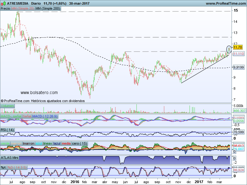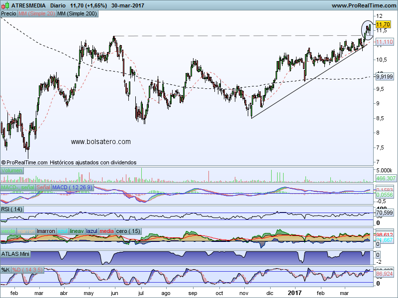 Atresmedia se comentó en su día ( www.bolsatero.com/2016/12/08/atresmedia-retomando-subidas ) y parece estar cumpliendo el patrón alcista planteado. De momento ha llegado al primer objetivo y tras una parada parece dirigirse a por el siguiente. La primera resistencia parece que la ha superado realizando incluso un pull back de confirmación por lo que podríamos seguir con la estrategia planteada en su día o incorporarnos en este punto. Si estamos desde hace tiempo será mantener el valor y si no podemos plantear una estrategia de entrada.