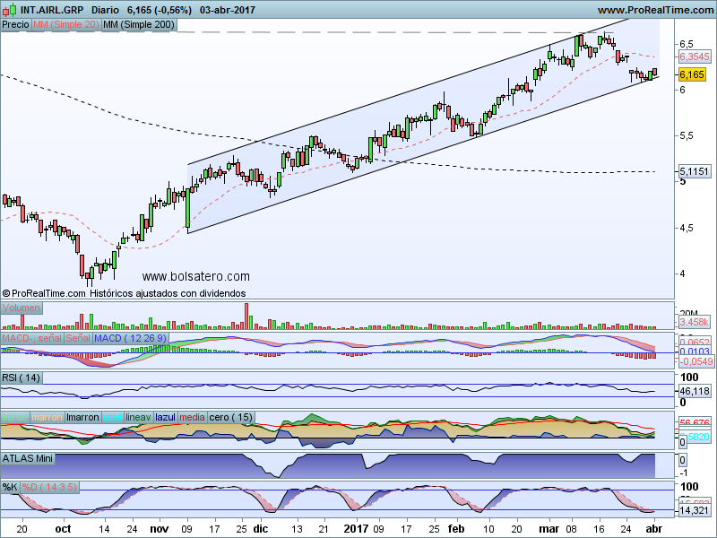 Tras una subida importante por parte de IAG llegó a su objetivo en 6.5 y desde ahí ha retrocedido. Ese retroceso se ha acentuado por la caída del precio del petróleo y por los inicios de las negociaciones por el Brexit. IAG es una empresa cuya sede está en Reino Unido y por tanto está muy afectada por ello. Sin embargo esa caída no ha hecho que el valor pierda el canal alcista que viene siguiendo. De hecho al llegar a la base del mismo se ha parado y ha remontado. Por ello se puede plantear su vuelta a las subidas aunque con cautela.