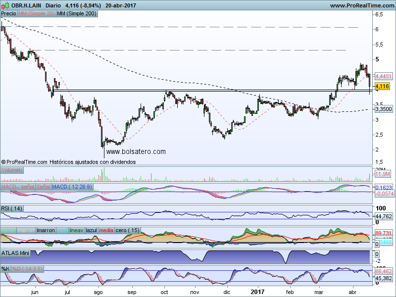Hace poco se comentaba que OHL de superar la resistencia en 4 abría objetivos de 5.2 y 6.1. La superó e hizo un pull back para confirmar la fuerza del nuevo soporte. Hoy ha vuelto a testearla y ha vuelto a aguantar. De hecho hoy ha sido con una caída fuerte y con mucho volumen. Ha habido noticias sobre la posible participación de la empresa en tramas de corrupción política y el registro de su sede habría sido la excusa perfecta para perder dicho soporte. Sin embargo ha aguantado a cierre y eso la hace más fuerte aún. Por no haber roto nada se puede volver a intentar una estrategia alcista en el valor.