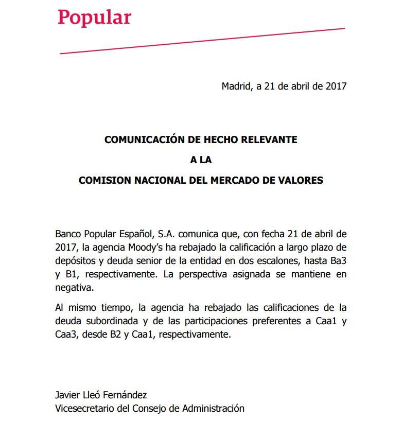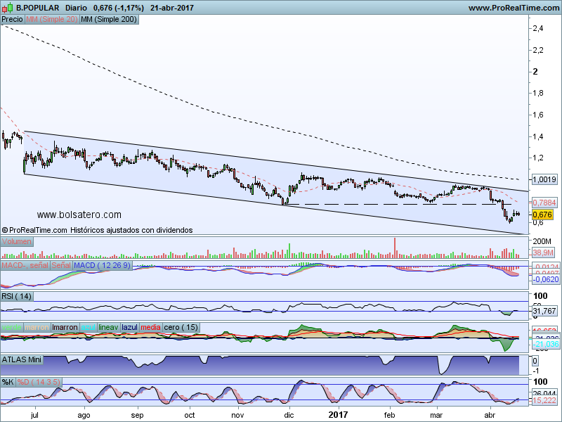Desde que Banco Popular anunciara un cambio en su cúpula han empezado a reconocer abiertamente lo que el mercado ya descontaba. O hay ampliación de capital, lo que sería la enésima, o fusión/adquisición por parte de otra entidad. No es algo nuevo y el mercado ya lo esperaba. Cuando hizo el reconocimiento de esas necesidades el valor se hundió haciendo nuevos mínimos históricos hasta 0.60. Cierto es que luego ha recuperado parte de la caída hasta 0.72 coincidente con el fibo 61.8 de la caída. Superar esa zona implicaría visitar 0.77-0.78 que eran los mínimos precedentes pero al no haberlo hecho…
