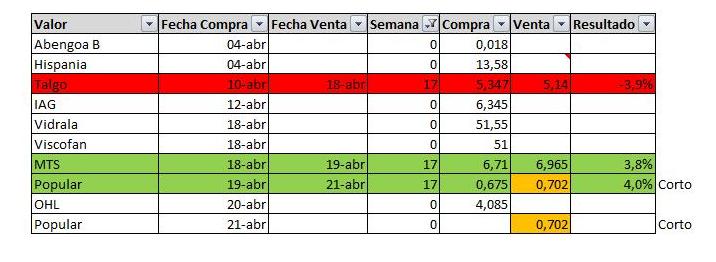 Vidrala. Un valor que se ha incorporado a la cartera esta semana. Comentábamos que está alcista pero esta semana se ha quedado en indecisión. Tiene poco volumen y si no remonta saldrá pronto de la cartera. Esperaba algo más de ella visto el comportamiento previo.