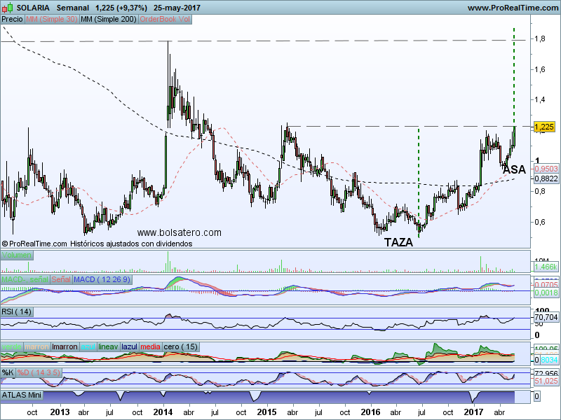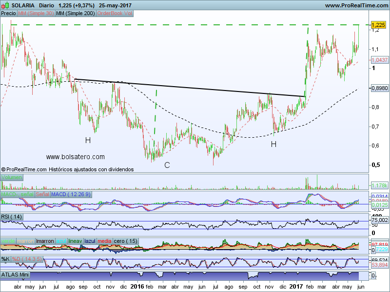 Tiempo llevaba Solaria sin dar grandes pistas de lo que quería hacer. En su momento realizó un HCHi muy rápidamente y desde ahí llegó a caer por debajo de 1. Desde entonces ha ido recuperando hasta volverse a situar en la zona de 1.2. Esta zona podría superarse y con ello activaría la figura que ha venido realizando conocida como Taza con Asa. En el caso que la figura se activase habría que preparar una estrategia para aprovechar las subidas.