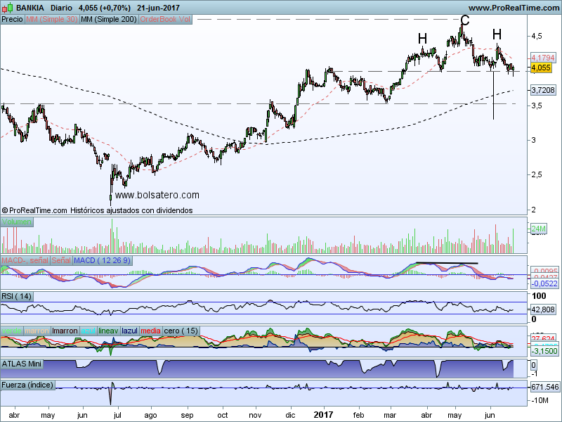 Bankia hace poco realizó un contrasplit de 4 a 1 por lo que sus acciones multiplicaron por 4 su precio. Esa es la razón por la que los precios quedan algo distorsionados respecto a otras entradas, aunque el dibujo técnico sigue siendo el mismo. El dibujo que ha venido dibujando los últimos meses es una figura de Hombro – Cabeza – Hombro. Esta figura tiene proyecciónes bajistas pero todavía no se puede dar por activada la misma. La neckline en intradía la ha perdido en alguna ocasión aunque la recupere a cierre de sesión. Visto ese escenario se puede tratar de buscar una operación desde el lado corto.