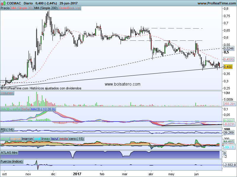 Coemac es un valor de poca capitalización que ha sufrido en los últimos tiempos. Desde que hiciera doble techo en 0.58 ha caído hasta la zona de 0.39-0.40 por donde pasaría su alcista de largo plazo. La caída brusca en el precio no ha sido acompañada en por el Macd por lo que ha dejado divergencias alcistas. Estas divergencias deberían hacer subir al valor aunque no sea inmediatamente. En todo caso se puede plantear un escenario alcista.