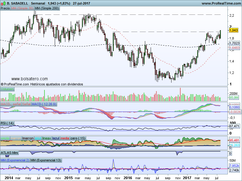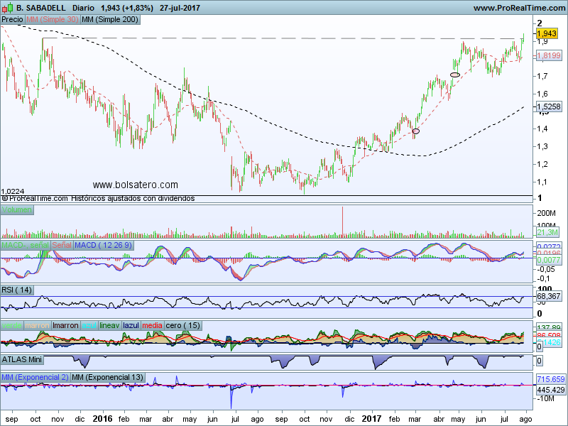 Banco Sabadell desde que hiciera mínimos en 1 hace un año ha ido recuperando con fuerza hasta el nivel actual. En la zona de 1.90 ha sido rechazado un par de veces pero esta vez lo está superando. Los resultados que presenta pueden ser el aliciente para romperlos definitivamente y dar el siguiente paso. Por ello se puede plantear una estrategia alcista en el valor.
