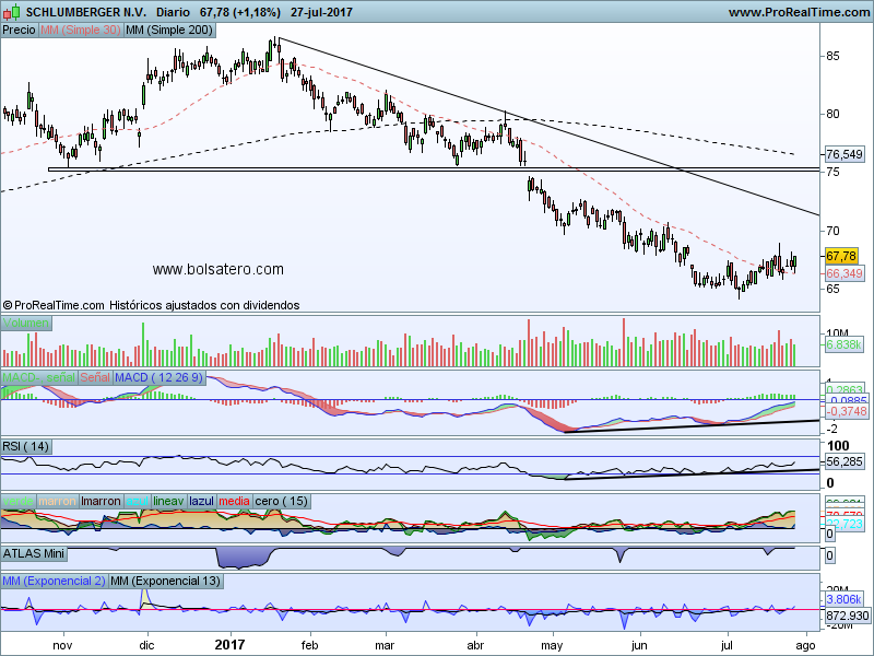 Schlumberger es una empresa del sector petrolífero y por tanto suele moverse al calor del precio del petróleo. Hay que considerar que los movimientos de la acción están afectados por las decisiones que se tomen respecto al petróleo. En cualquier caso el valor lleva un año bastante negativo que le ha hecho caer un 25% y parece que esas caídas están llegando a su fin. Por tanto se puede plantear una estrategia alcista en el valor.