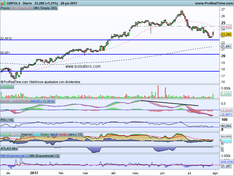Esta semana presentó resultados Grifols y estos fueron buenos. Debido a ello el valor confirmó el movimiento de giro que había iniciado. Durante las últimas semanas el valor había caído desde 27 hasta buscar apoyo en su última zona de resistencia en 22.5. Ahí empezó a girar y los buenos resultados han sido el aliciente que necesitaba para confirmarlo. Por esa razón se podría plantear entrar en el valor.