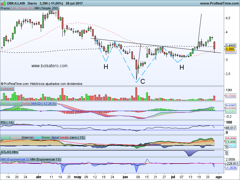 OHL presentó los resultados del primer semestre y volvieron a ser bastante malos. No tiene pinta de cumplir los objetivos planteados y el mercado suele castigar esos resultados. La acción bajó con fuerza tras la presentación de los mismos. Sin embargo esa bajada podría no ser más que un throwback a una figura de Hombro – Cabeza – Hombro invertido. En ese caso se puede plantear entrar en el valor siempre y cuando se ajusten bien los stops de pérdidas.