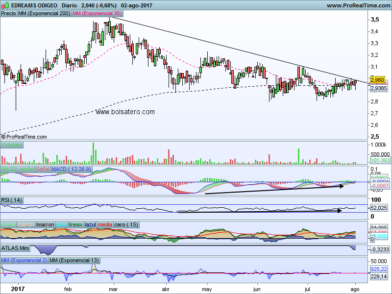 Vaya por delante lo traicionera que puede ser Edreams. Es una acción que lleva tiempo bajando y aguantando en su media de largo plazo que está haciendo de soporte.Cierto es que ha perdido la media en varias ocasiones pero sin demasiada fuerza. En esta ocasión se puede plantear una estrategia alcista en el valor siempre y cuando se cumplan las condiciones.