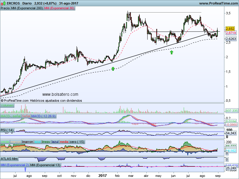 Ercros es un valor alcista de largo plazo. La subida ha venido dirigida con una alcista que ha venido respetando hasta no hace mucho. El último toque la perforó y eso hizo saltar las alarmas pero la media de largo plazo aguantó el precio. Desde ahí ha remontado con fuerza volviendo a entrar sobre la alcista por lo que se puede pensar en una estrategia alcista.