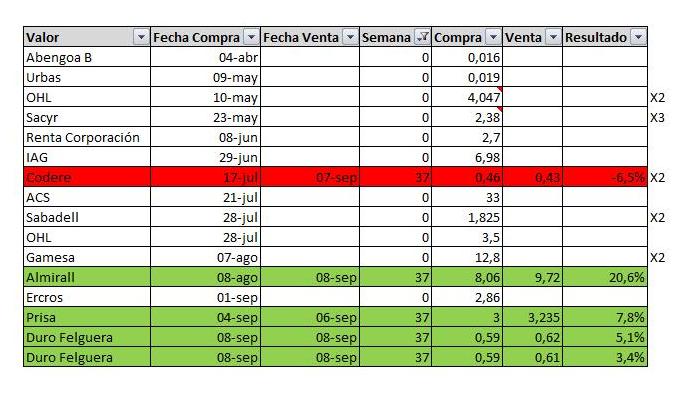 La cartera esta semana ha tenido movimiento después de una época estival bastante aburrida. Se han cerrado posiciones, se han hecho otras en el corto plazo y se han aumentado posiciones en algún valor. Ha sido bastante movida por lo que la comentamos en detalle.