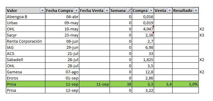 Prisa. Se realizó una entrada en el valor aprovechando el buen momento de la acción tras haber superado la resistencia en 3.2 buscando el muy corto plazo. La segunda entrada se hizo tras el throwback de la acción a la resistencia superada y buscando en esta entrada más largo plazo.
