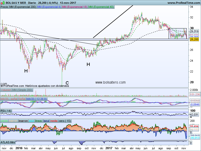 La estrategia pasaría por comprar a estos precios cuando empiece a girar, algo que todavía no ha hecho. El objetivo podríamos dividirlo en 3 que serían 30 (máximos recientes), 33 (máximos de medio plazo) y 36 (objetivo del HCHi). El stop lo tendríamos que ejecutar si el valor perdiese de manera clara 27.5 o tocase en diario 27. La relación Rentabilidad/riesgo permite hacer la operación.