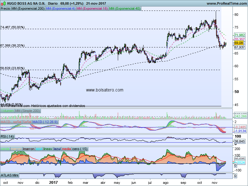 Hugo Boss es una empresa textil que cotiza en el mercado alemán. En 2015 cotizaba en la zona de 105 y la caída posterior llevó al valor a caer cerca de un 50% de su cotización. En esa zona de mínimos hizo doble suelo en 2016 y empezó la recuperación Esa subida ha llevado al precio hasta el fibo 61.8 (82) donde fue rechazado y ha vuelto al fibo 38.2 (67). Por esa zona pasa la media de largo plazo y parece estar entrando dinero. Por esa razón se puede plantear una estrategia alcista en el valor.