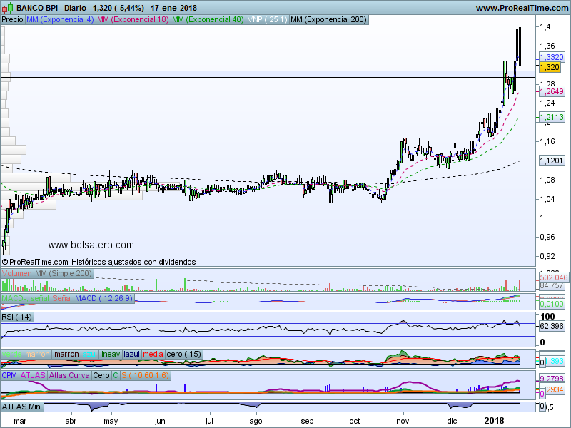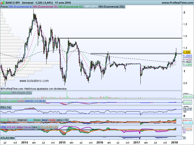 BPI es uno de los principales bancos portugueses y su cotización refleja muy bien el estado de la economía portuguesa. Antes de la crisis de 2008 llegó a estar a niveles de 6 mientras que una vez que estalló la crisis llegó a cotizar por debajo de 1. Desde ahí ha ido remontando y se encuentra atacando una resistencia de la muchas que ha ido dejando en la caída. La resistencia ha conseguido superarla a cierre diario por lo que se puede pensar en una estrategia alcista.