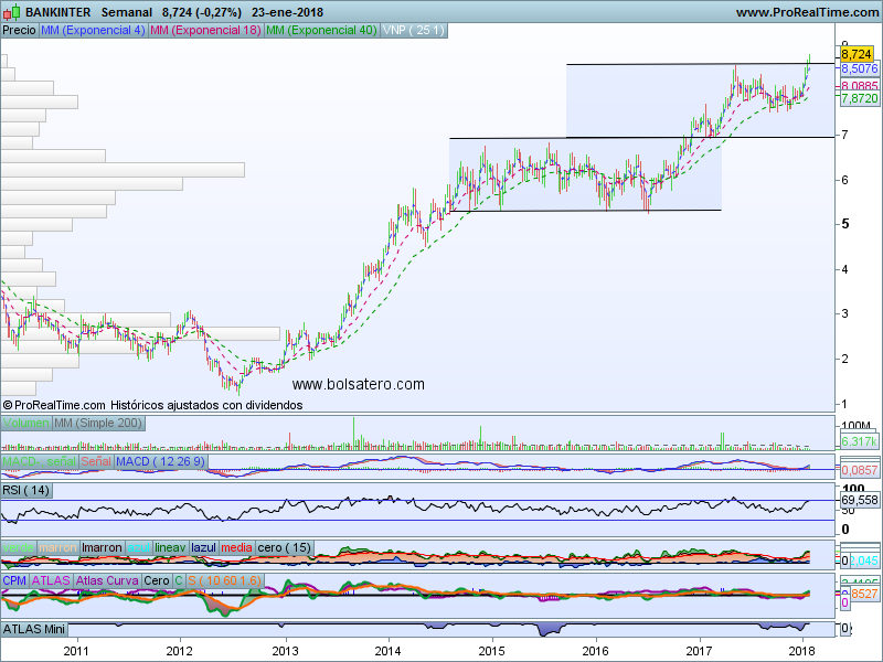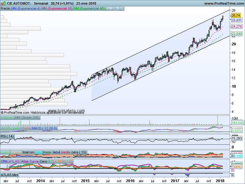El valor sigue haciendo máximos tras máximos desde que superó 17 a mediados del año pasado. Las debilidades han servido para incorporarse ya que después de las mismas ha continuado subiendo. Podríamos marcar como objetivo 25 en base al canal que le está sirviendo en la subida mientras que si lo perdiese indicaría salida. Como en el resto de casos también podríamos mantener mientras las medias nos lo permitiesen.