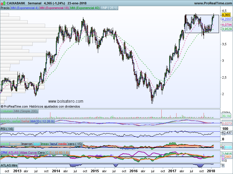 El banco todavía no ha entrado en subida libre pero lo conseguiría superando 4.45. En ese caso activaría objetivo de lateralidad que habría que situarlo en 5. Si marcase entrada el stop no deberíamos situarlo mucho más lejos de 4.2 ya que podría volver si lo pierde a la base de la caja.