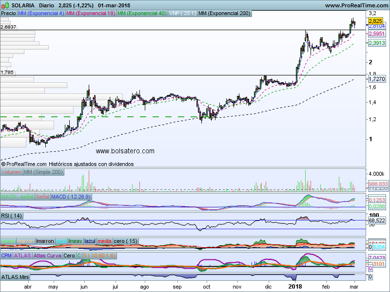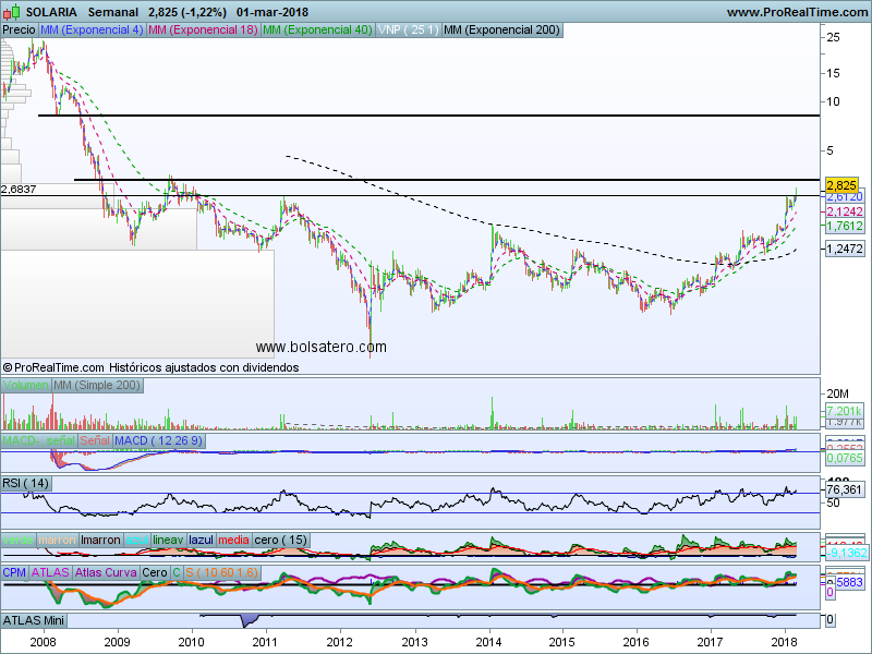 Solaria es un valor que ha subid de manera importante durante los últimos meses. Desde Octubre lleva una subida del 100% y no parece que vaya a terminar ahí. La resistencia que tenía en 2.6 la ha logrado superar por lo que habría que pensar en objetivos más ambiciosos. Cierto es que no hay tanto cambio ni en el valor ni en el sector pero es un valor que está «caliente» ahora mismo y se puede tratar de aprovechar. Por ello se puede plantear una estrategia alcista.
