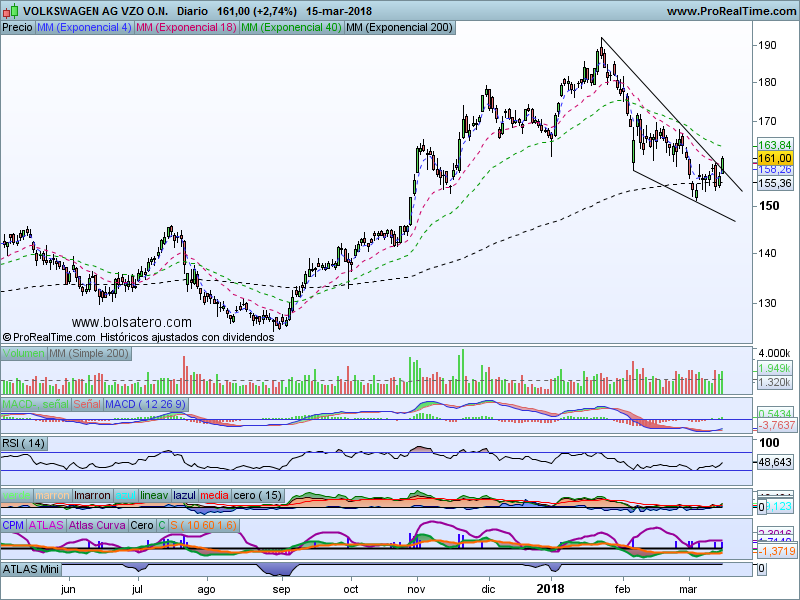 Volkswagen es recordada por sus trucos para pasar la prueba de emisiones. Eso provocó grandes caídas en su momento y tomó medidas importantes como fue reorganizar la cúpula. Aquel episodio de 2015 hizo que la acción se desplomara llegando a cotizar por debajo de 100. Hoy en día ese hecho ha quedado olvidado y sus cuentas de resultados una vez indemnizados a todos los estafados por las emisiones han resultado buenos. Los resultados han coincidido en un momento en el que el precio estaba realizando una cuña que ha roto. Por ello se puede plantear una estrategia alcista