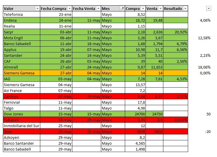 Los mercados han tenido un mes bajista durante mayo con fuertes pérdidas sobre todo a final de mes. El tema político tanto en España como en Italia son los responsables de dicho movimiento. Se han presentado los resultados empresariales y no han empeorado por lo que parece algo coyuntural. Si los gobiernos de España como de Italia logran estabilizarse junio debería ser un mes bastante alcista. Este mes hemos sufrido un descalabro con Tubacex tras presentar su plan estratégico. Por otro lado el fuerte interés en Sacyr ha compensado dicha pérdida. Para junio estimamos que el castigo en los bancos debe calmarse y por tanto somos alcistas en el sector.