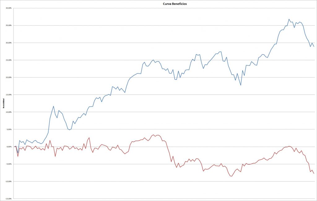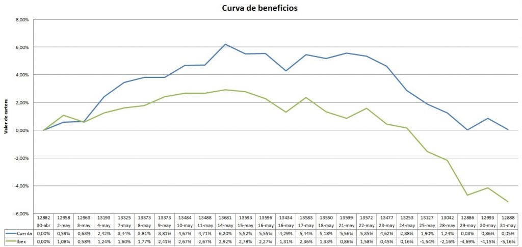 La gestión de capital sigue siendo un punto muy importante en la operativa y el drawdown ha sido durante el mes de mayo de un 6%. La cartera este mes ha tenido una revalorización del 0.05% frente a la caída del 5.13% por parte del ibex. Para realizar la curva de beneficios se ha tomado el último precio de la sesión.