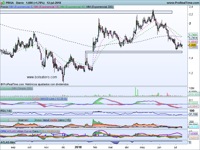 La estrategia en Prisa pasaría por comprar lo más cercano posible a 1.5. Mientras mantenga la zona habría que pensar en visitar 1.75 como primer objetivo para posteriormente ir a 2 y 2.2. El stop habría que ejecutarlo si el precio perdiera esa zona a cierre de sesión.
