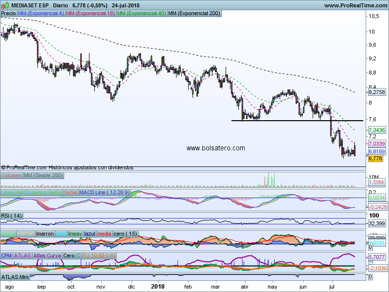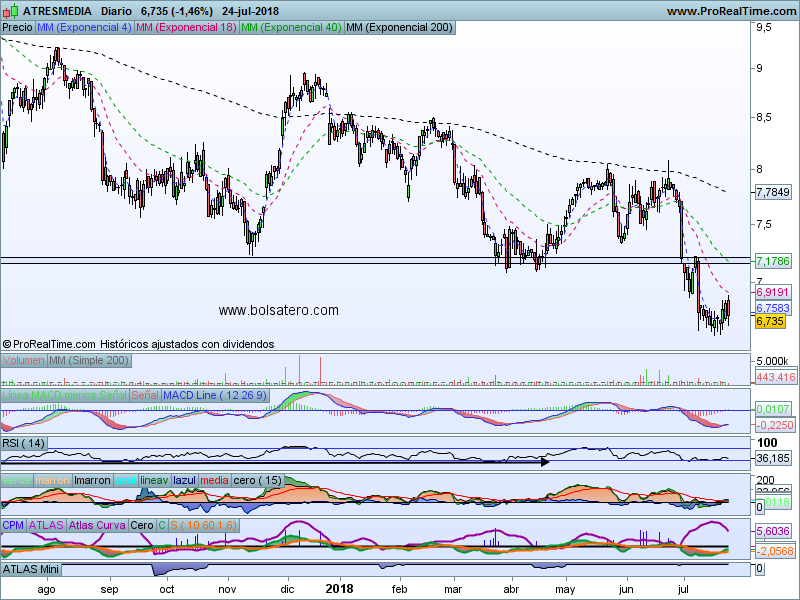 Las televisiones que cotizan, Atresmedia y Mediaset, suelen tener comportamientos parecidos. No iguales porque la amplitud de movimientos difiere, pero son bastante similares en cuanto a la dirección que toman. Ambas llevan un año bastante malo con pérdidas en su cotización cercanas al 30%. También han perdido hace poco el soporte ambas y han llegado a las cercanías de otro soporte pero sin sin llegar a tocarlo. Ambas están intentando hacer suelo y girarse antes de los resultados. Pueden estar dando pie a un rebote que puede aprovecharse.