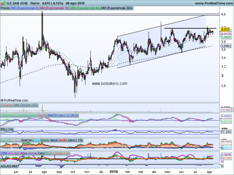 La estrategia en Grupo San José pasaría por comprar una vez superado 4.2. Una vez superada esa resistencia no tendría inconvenientes en ir a ver 4.6 rápidamente donde situaríamos el objetivo. En caso de producirse entrada el stop habría que situarlo por debajo de 4. La relación Rentabilidad/riesgo permite hacer la operación.