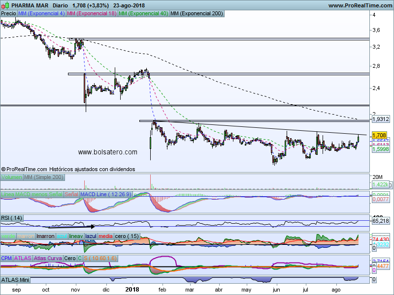 Los indicadores son positivos en el corto y medio plazo. El volumen en la rotura de la bajista debería ser reseñable para que fuera creíble la misma. En época de chicharros como está siendo ahora phamamar es un valor que siempre da bastante juego y podría volverlo a dar.